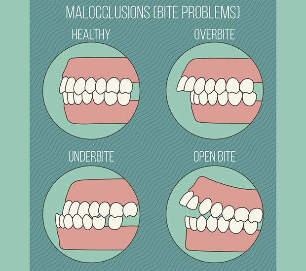 A. In a healthy bite, the upper teeth fit just over the lower teeth. However, in some patients, the lower jaw may push forward or slides back. Others patients may have a crossbite. This condition causes the jaw to slide to one side. Jaw misalignments are known as malocclusion.